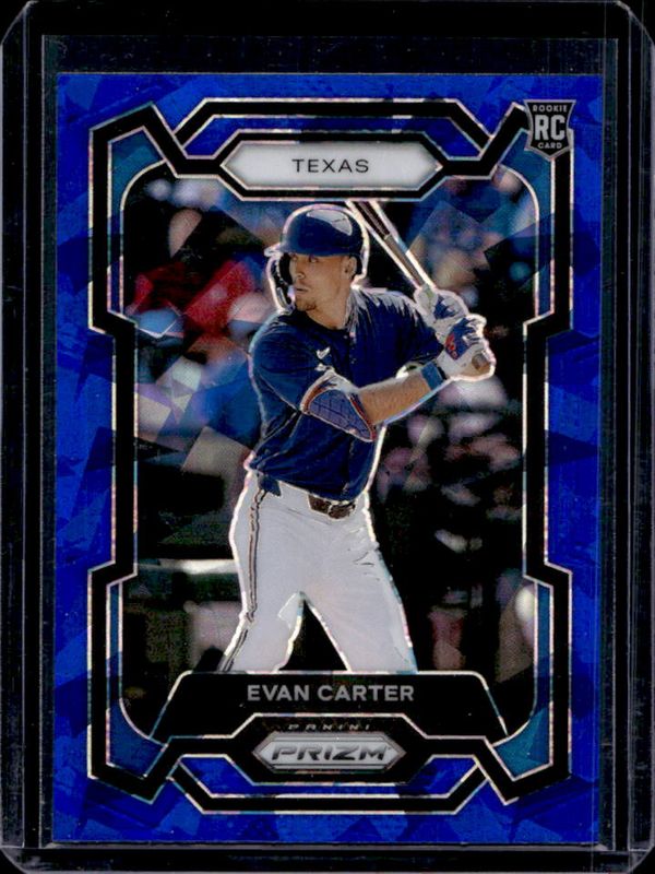 The Evan Carter 2024 Prizm #274 Blue Ice Rookie card is 1 of 59 Evan Carter's card variations in the 2024 Prizm set being tracked by Sports Card Investor, including Base, Green, Green Ice, Pink Ice, and Red Ice.