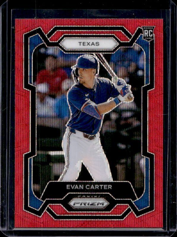 The Evan Carter 2024 Prizm #274 Ruby Wave Rookie card is 1 of 59 Evan Carter's card variations in the 2024 Prizm set being tracked by Sports Card Investor, including Base, Blue Ice, Green, Green Ice, and Pink Ice.