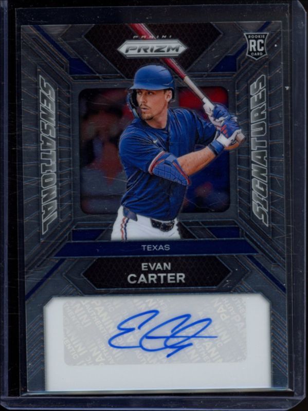 The Evan Carter 2024 Prizm #SS-EC Sensational Signatures Rookie card is 1 of 59 Evan Carter's card variations in the 2024 Prizm set being tracked by Sports Card Investor, including Base, Blue Ice, Green, Green Ice, and Pink Ice.