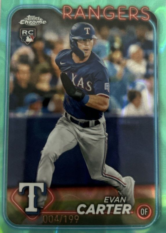 2024 Topps Chrome Evan Carter #136 Aqua RayWave Refractor 86/199 RC Rangers