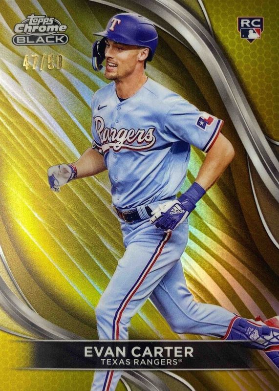 The Evan Carter 2024 Topps Chrome Black #83 Gold Refractor /50 Rookie card in Raw condition has not changed in price in the last 30 days and was last sold for $14.99 .