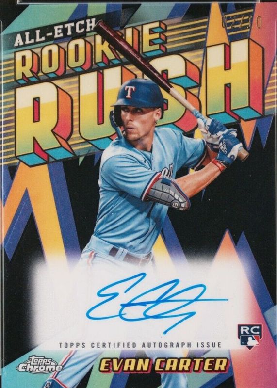 The Evan Carter 2024 Topps Chrome #CERA-EVA Chrome All-Etch Rookie Rush Autographs - Black Refractor /10 card in Raw condition has not changed in price in the last 30 days and was last sold for $150.00 .