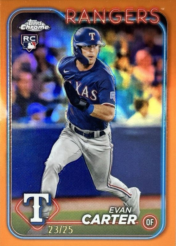 The Evan Carter 2024 Topps Chrome #136 Orange Refractor /25 Rookie card in Raw condition has not changed in price in the last 30 days and was last sold for $115.00 .