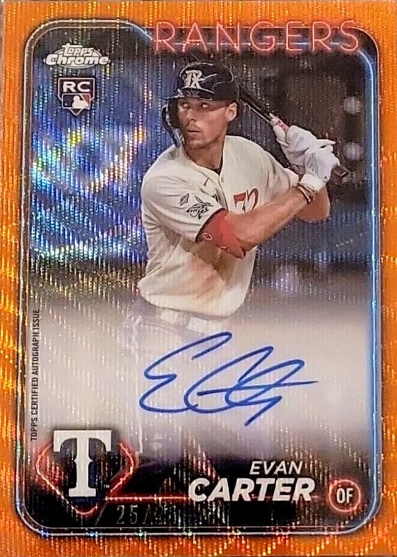 The Evan Carter 2024 Topps Chrome #RA-EC Rookie Autographs - Orange Wave Refractor /25 card in Raw condition has not changed in price in the last 30 days and was last sold for $361.00 .