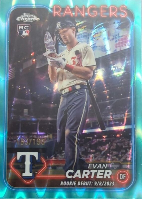 The Evan Carter 2024 Topps Chrome Update #USC199 Rookie Debut - Aqua RayWave Refractor /199 card in Raw condition has not changed in price in the last 30 days and was last sold for $3.26 .