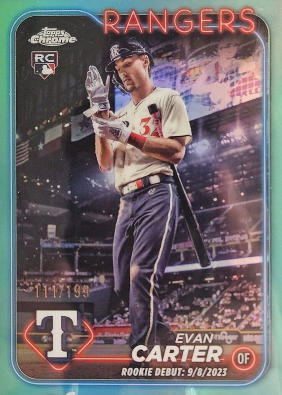 The Evan Carter 2024 Topps Chrome Update #USC199 Rookie Debut - Aqua Refractor /199 card in Raw condition has not changed in price in the last 30 days and was last sold for $4.00 .