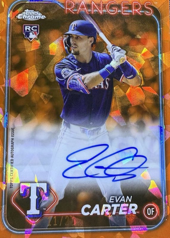 This card is 1 of 14 Evan Carter's card variations in the 2024 Topps Chrome Update Sapphire Edition set being tracked by Sports Card Investor, including Rookie Debut, Rookie Debut - Gold /50, Rookie Debut - Orange /25, Rookie Debut - Black /10, and Rookie Debut - Red /5.