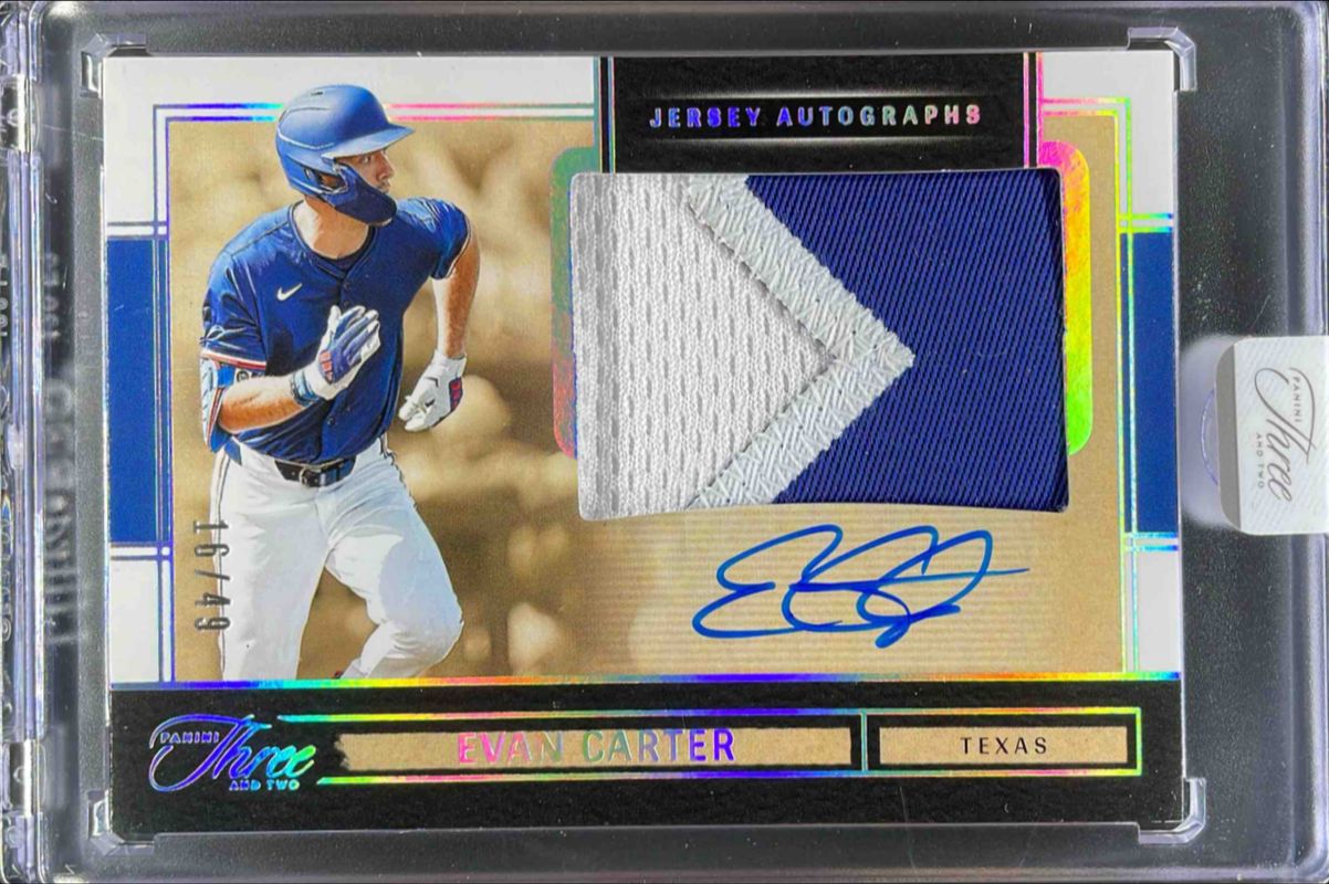The Evan Carter 2025 Panini Three and Two #33 Jersey Autographs - Holo Silver /49 card is 1 of 24 Evan Carter's card variations in the 2025 Panini Three and Two set being tracked by Sports Card Investor, including Base /99, Holo Silver /49, Full Count /32, Navy Blue /25, and Holo Blue /15.