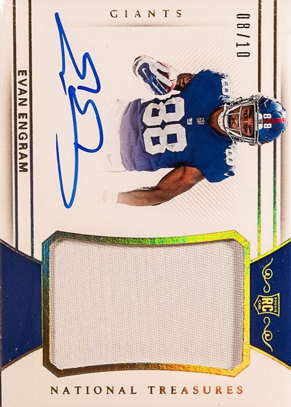 This card is 1 of 11 Evan Engram's card variations in the 2017 National Treasures set being tracked by Sports Card Investor, including Rookie Patch Auto - Green Jersey Number (/88), Rookie Patch Auto /99, Rookie Patch Auto - Holo Silver /25, The Future Signatures /25, and Rookie Patch Auto - Stars & Stripes /13.