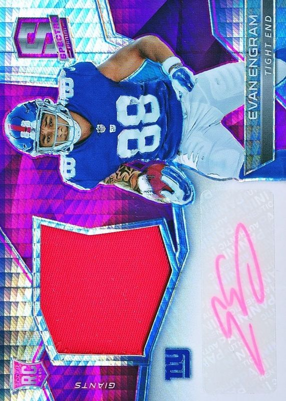 This card is 1 of 10 Evan Engram's card variations in the 2017 Spectra set being tracked by Sports Card Investor, including Rookie Patch Auto /99, Rookie Patch Auto - Neon Blue /75, Rookie Patch Auto - Neon Green /50, Rookie Patch Auto - Neon Black Light /10, and Rookie Patch Auto - Neon Orange /5.