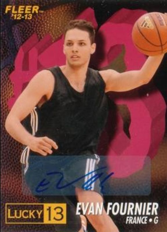 The Evan Fournier 2012 Fleer Retro #4 1996-97 Lucky 13 Autographs Rookie card is 1 of 5 Evan Fournier's card variations in the 2012 Fleer Retro set being tracked by Sports Card Investor, including Base, 1996-97 Lucky 13, Autographs, and Mystique Fresh Ink.