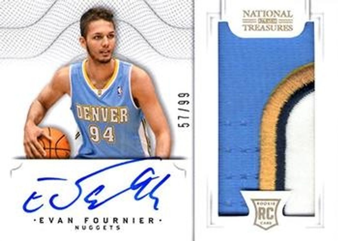 The Evan Fournier 2012 National Treasures #170 Base /99 Rookie card is 1 of 9 Evan Fournier's card variations in the 2012 National Treasures set being tracked by Sports Card Investor, including Rookie Patch Auto /99, Rookie Patch Auto - Jersey Number Prime /25, Rookie Patch Auto - Gold /5, Printing Plates Black /1, and Printing Plates Cyan /1.