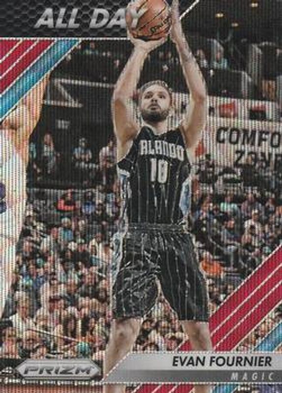 The Evan Fournier 2016 Prizm #6 All Day - Ruby Wave card is 1 of 26 Evan Fournier's card variations in the 2016 Prizm set being tracked by Sports Card Investor, including Base, Green, Ruby Wave, Starburst, and Blue Wave /99.