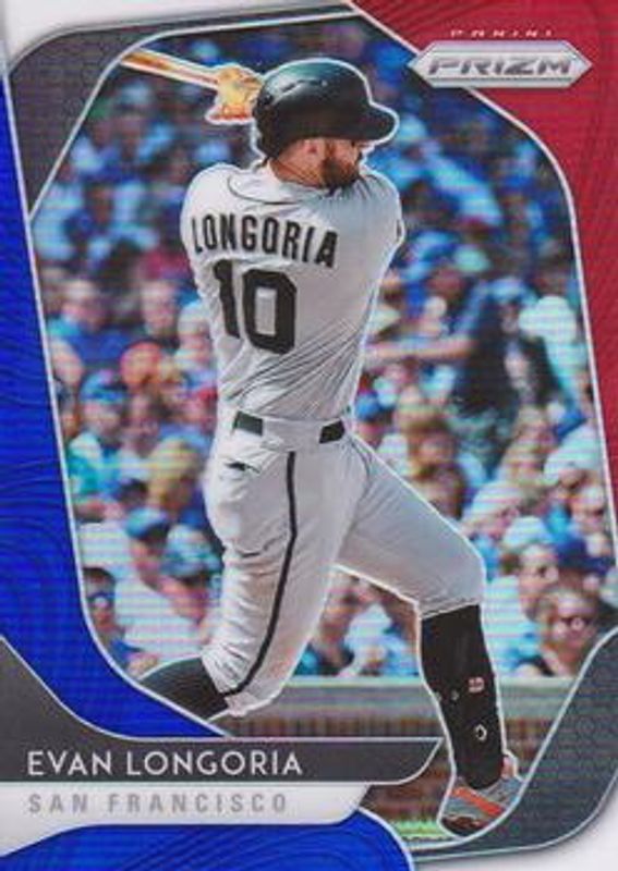 The Evan Longoria 2020 Prizm #79 Red White Blue card is 1 of 37 Evan Longoria's card variations in the 2020 Prizm set being tracked by Sports Card Investor, including Base, Blue, Carolina Blue, Cosmic Haze, and Green.