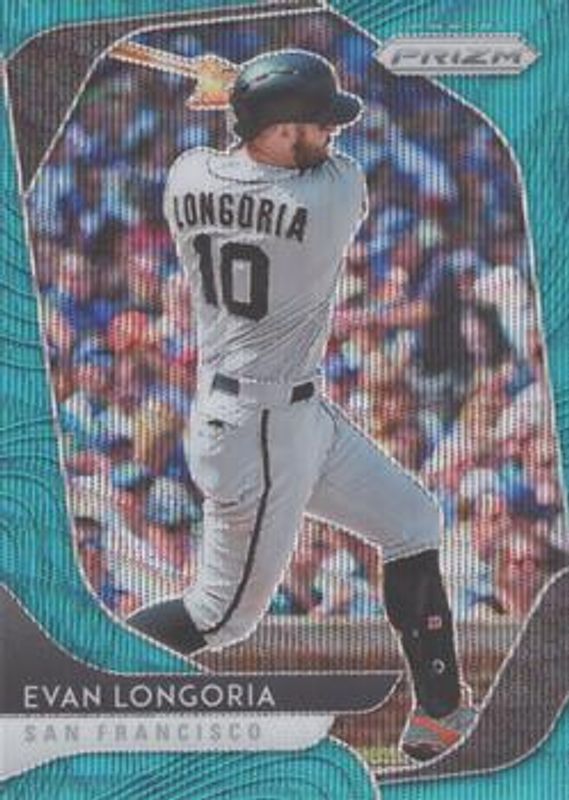 The Evan Longoria 2020 Prizm #79 Teal Wave card is 1 of 37 Evan Longoria's card variations in the 2020 Prizm set being tracked by Sports Card Investor, including Base, Blue, Carolina Blue, Cosmic Haze, and Green.