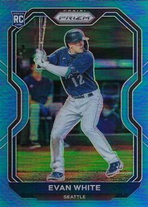 The Evan White 2021 Prizm #89 Carolina Blue Rookie card is 1 of 75 Evan White's card variations in the 2021 Prizm set being tracked by Sports Card Investor, including Base, Blue, Blue Velocity, Cosmic Haze, and Giraffe.