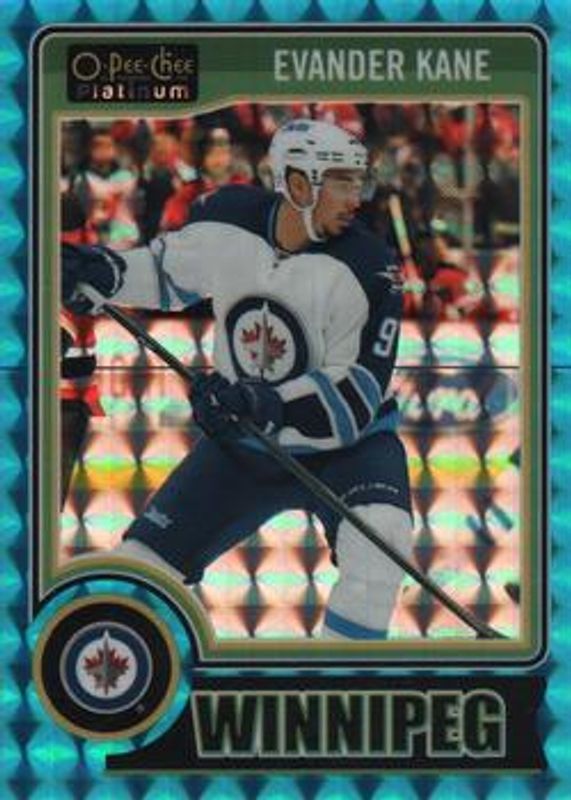 The Evander Kane 2014 O-Pee-Chee Platinum #50 Blue Cube /65 card is 1 of 17 Evander Kane's card variations in the 2014 O-Pee-Chee Platinum set being tracked by Sports Card Investor, including Base, Platinum Traxx, Rainbow, White Ice /199, and Red Prism /135.