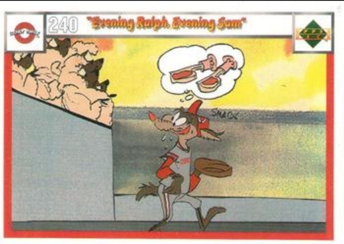 The Evening Ralph, Evening Sam 1990 Upper Deck Comic Ball #240-/-249 Base card is 1 of 13 Evening Ralph, Evening Sam's card variations in the 1990 Upper Deck Comic Ball set being tracked by Sports Card Investor, including #235-/-250 Base, #236-/-251 Base, #237-/-252 Base, #238-/-247 Base, and #239-/-248 Base.