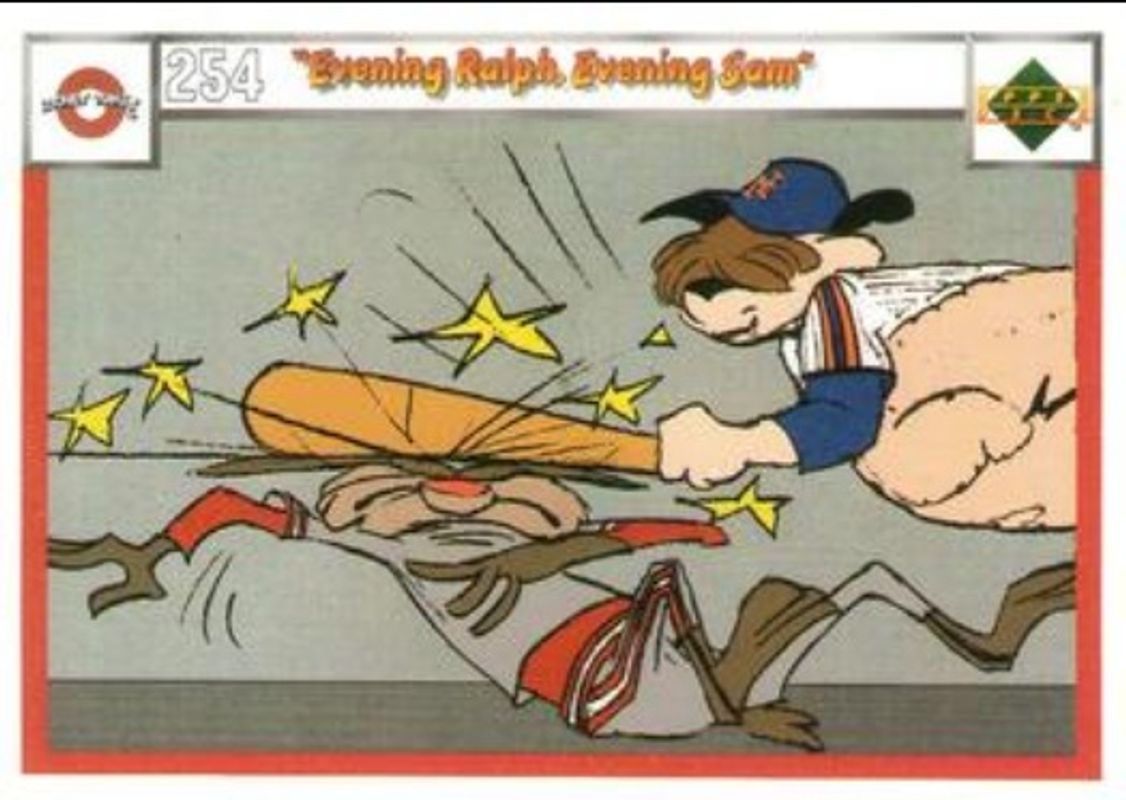 The Evening Ralph, Evening Sam 1990 Upper Deck Comic Ball #254-/-269 Base card is 1 of 13 Evening Ralph, Evening Sam's card variations in the 1990 Upper Deck Comic Ball set being tracked by Sports Card Investor, including #235-/-250 Base, #236-/-251 Base, #237-/-252 Base, #238-/-247 Base, and #239-/-248 Base.