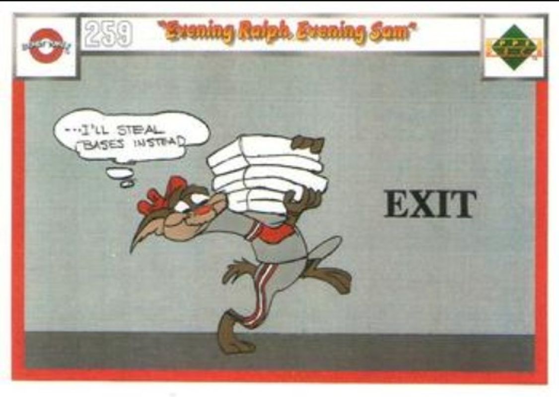 The Evening Ralph, Evening Sam 1990 Upper Deck Comic Ball #259-/-262 Base card is 1 of 13 Evening Ralph, Evening Sam's card variations in the 1990 Upper Deck Comic Ball set being tracked by Sports Card Investor, including #235-/-250 Base, #236-/-251 Base, #237-/-252 Base, #238-/-247 Base, and #239-/-248 Base.