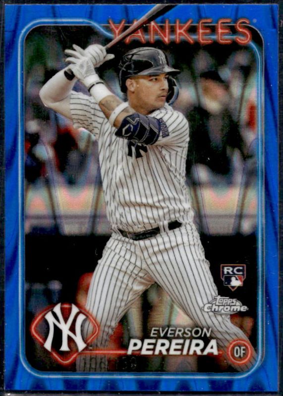 The Everson Pereira 2024 Topps Chrome #238 Blue RayWave Refractor /150 Rookie card is 1 of 32 Everson Pereira's card variations in the 2024 Topps Chrome set being tracked by Sports Card Investor, including Base, Pink Refractor, Lightboard Logo Refractor, X Fractor, and Aqua RayWave Refractor /199.