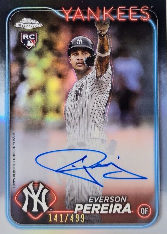 The Everson Pereira 2024 Topps Chrome #RA-EP Rookie Autographs - Refractor /499 card in Raw condition has not changed in price in the last 30 days and was last sold for $5.00 .