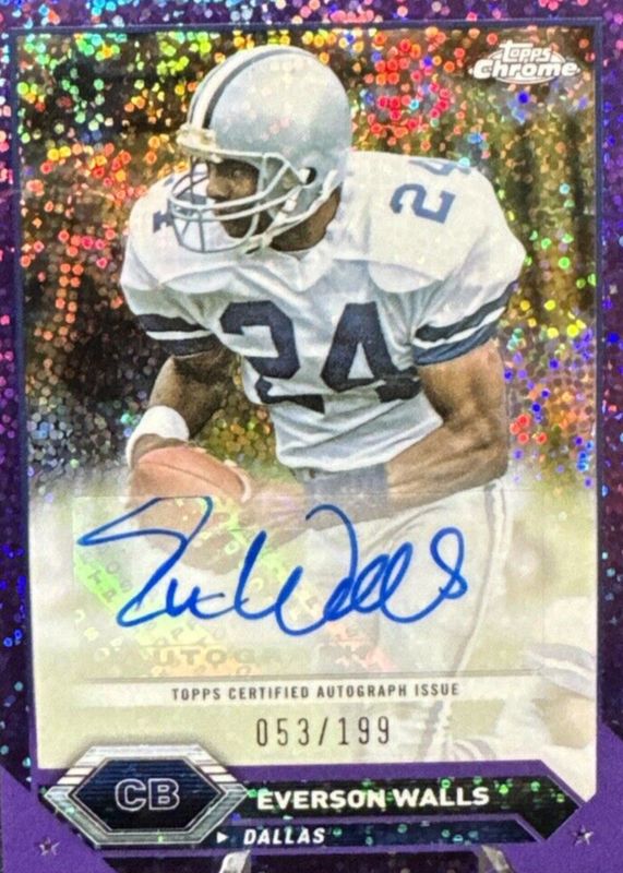 The Everson Walls 2023 Topps Composite #TCA-EW Chrome Autographs - Purple Speckle Refractor /199 card in Raw condition has not changed in price in the last 30 days and was last sold for $7.99 .