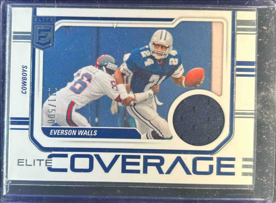 The Everson Walls 2024 Elite #ECO-EWA Elite Coverage /500 card is 1 of 2 Everson Walls' card variations in the 2024 Elite set being tracked by Sports Card Investor, including Elite Coverage - Prime /49.