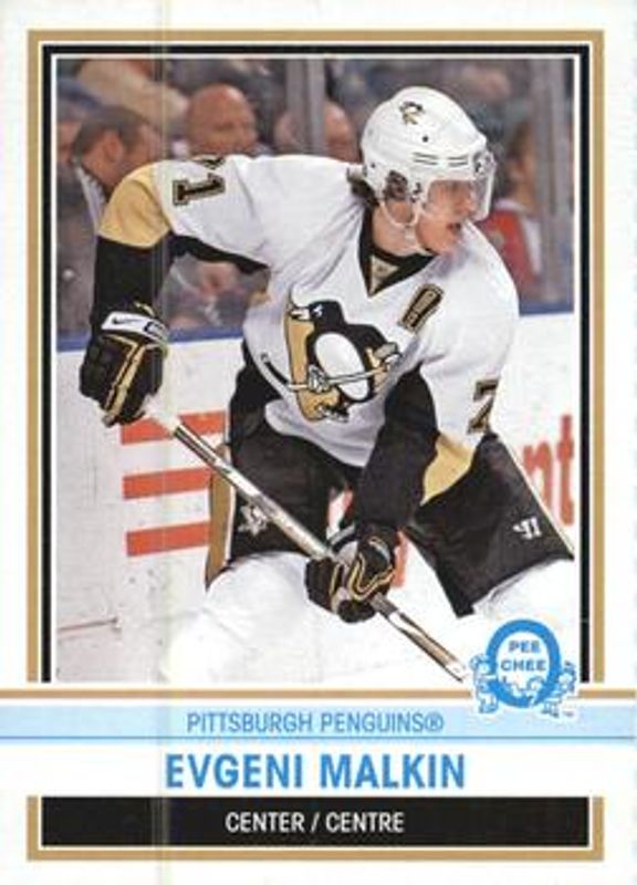 The Evgeni Malkin 2009 O-Pee-Chee Retro Box Bottoms card is 1 of 14 Evgeni Malkin's card variations in the 2009 O-Pee-Chee set being tracked by Sports Card Investor, including Base, Rainbow, Retro, Retro Blank Back, and Retro Rainbow /100.