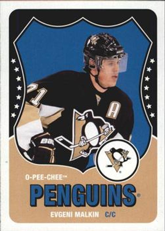 The Evgeni Malkin 2010 O-Pee-Chee Retro Blank Back card is 1 of 6 Evgeni Malkin's card variations in the 2010 O-Pee-Chee set being tracked by Sports Card Investor, including Base, Retro, Retro Rainbow, Retro Black Rainbow /100, and Retro Box Bottoms.