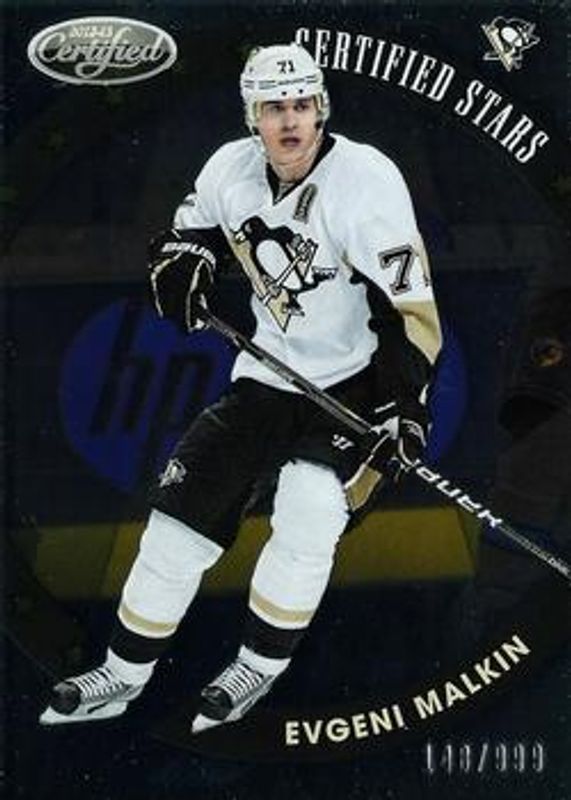 The Evgeni Malkin 2012 Certified #S2 Certified Stars /999 card is 1 of 14 Evgeni Malkin's card variations in the 2012 Certified set being tracked by Sports Card Investor, including Base /999, Mirror Red /100, Mirror Hot Box /75, Mirror Blue /50, and Mirror Gold /25.