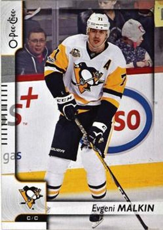 The Evgeni Malkin 2017 O-Pee-Chee #5 Base card is 1 of 13 Evgeni Malkin's card variations in the 2017 O-Pee-Chee set being tracked by Sports Card Investor, including Rainbow Foil, Red, Retro, Retro Blank Back, and Black Rainbow Foil /100.