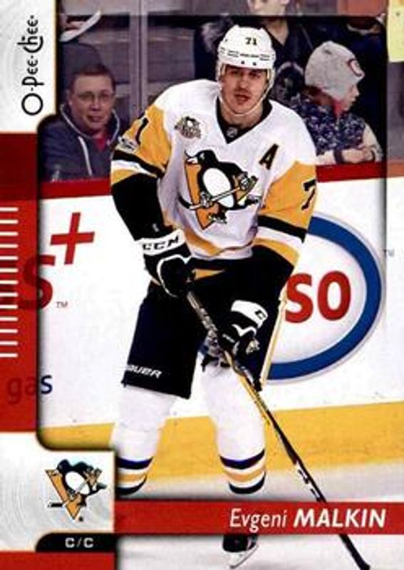 The Evgeni Malkin 2017 O-Pee-Chee #5 Red card is 1 of 13 Evgeni Malkin's card variations in the 2017 O-Pee-Chee set being tracked by Sports Card Investor, including Base, Rainbow Foil, Retro, Retro Blank Back, and Black Rainbow Foil /100.