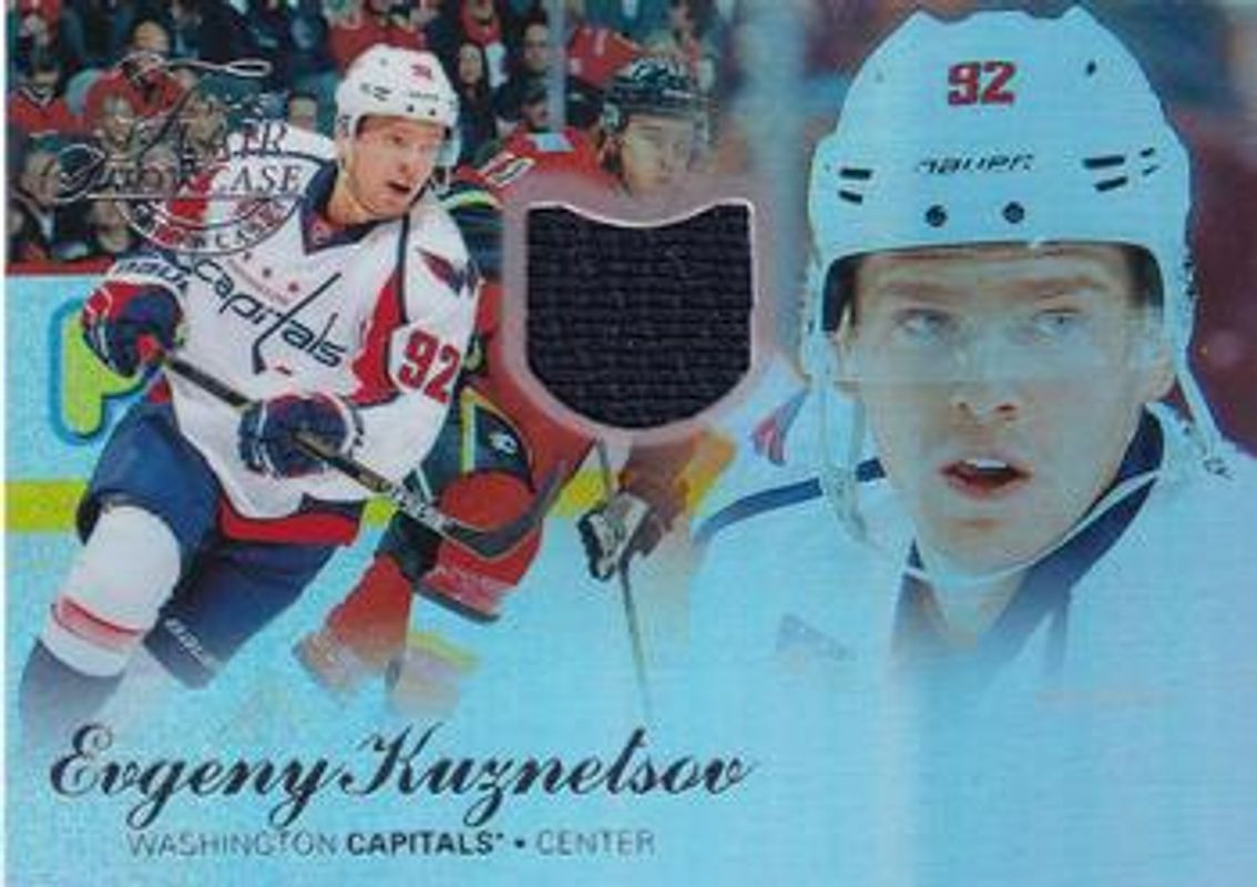 The Evgeny Kuznetsov 2014 Fleer Showcase #52 Flair Showcase Jerseys Rookie card is 1 of 18 Evgeny Kuznetsov's card variations in the 2014 Fleer Showcase set being tracked by Sports Card Investor, including Base /399, Precious Metal Gems Blue /100, Red Glow /27, White Hot /9, and '14 Ultra Autographs Buyback COAs.