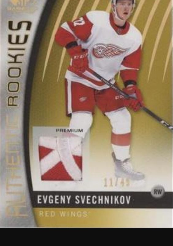 The Evgeny Svechnikov 2017 SP Game Used #94 Spectrum Gold Premium Materials /49 Rookie card is 1 of 15 Evgeny Svechnikov's card variations in the 2017 SP Game Used set being tracked by Sports Card Investor, including Base /73, Blue Autographs, Red Autographed Jerseys, Gold Jerseys /399, and Authentic Rookies Rainbow /218.