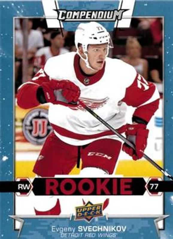 The Evgeny Svechnikov 2017 Upper Deck Compendium #581 Blue Rookie card is 1 of 6 Evgeny Svechnikov's card variations in the 2017 Upper Deck Compendium set being tracked by Sports Card Investor, including Gold, Printing Plates Black /1, Printing Plates Cyan /1, Printing Plates Magenta /1, and Printing Plates Yellow /1.