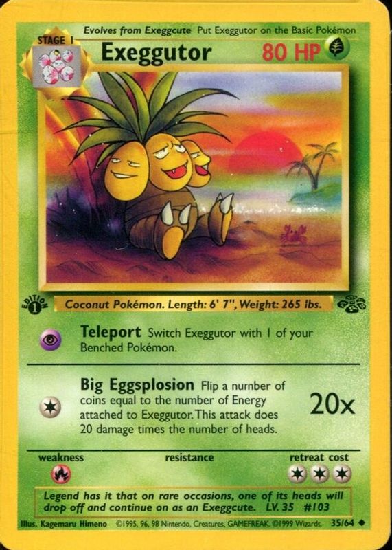 The Exeggutor 1999 Jungle #35/64 1st Edition card in Raw TCG (Near Mint) condition has moved down -$4.05 (-49.8%) in the last 30 days and was last sold for $4.08 .