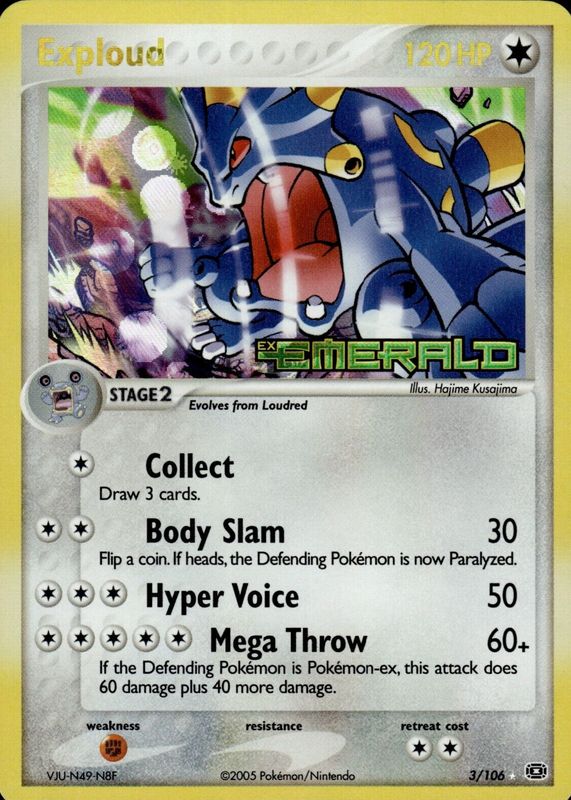 The Exploud 2005 EX: Emerald #003/106 Reverse Holo card in Raw TCG (Near Mint) condition has not changed in price in the last 30 days and was last sold for $12.97 .