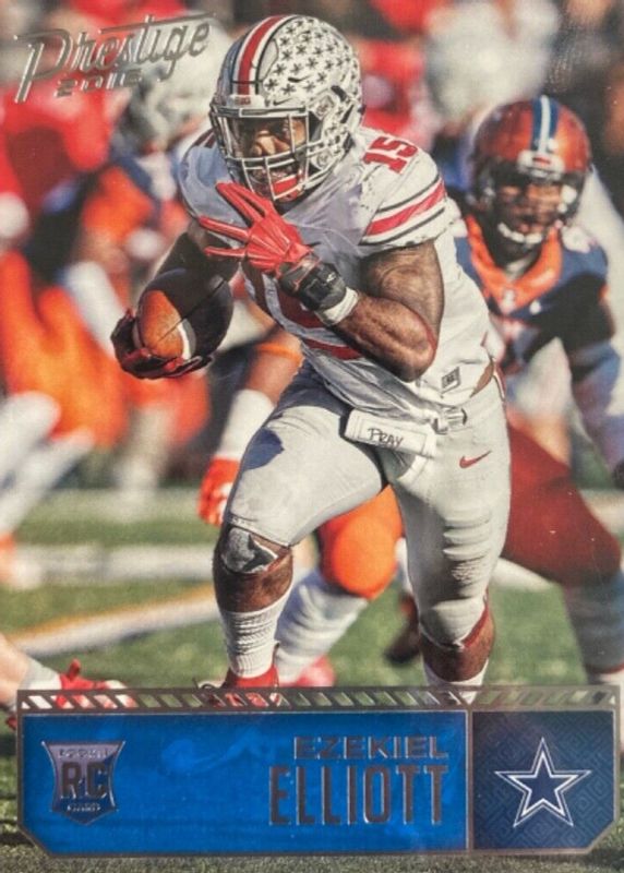 The Ezekiel Elliott 2016 Prestige #217 Base Rookie card in Raw condition has not changed in price in the last 30 days and was last sold for $1.99 .
