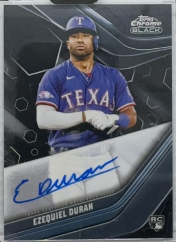 The Ezequiel Duran 2023 Topps Chrome Black #CBA-ED Autographs Rookie card is 1 of 8 Ezequiel Duran's card variations in the 2023 Topps Chrome Black set being tracked by Sports Card Investor, including Autographs - Refractor /150, Autographs - Green Refractor /99, Autographs - Gold Mini Diamond Refractor /50, Autographs - Gold Refractor /50, and Autographs - Orange Refractor /25.