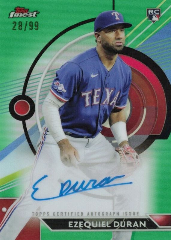 This card is 1 of 11 Ezequiel Duran's card variations in the 2023 Topps Finest set being tracked by Sports Card Investor, including Finest Autographs, Finest Autographs - Blue Refractor /150, Finest Autographs - Green Wave Refractor /99, Finest Autographs - Gold Refractor /50, and Finest Autographs - Gold Wave Refractor /50.