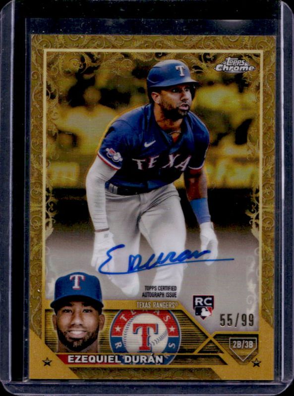 The Ezequiel Duran 2023 Topps Gilded Collection #CGA-EDU Chrome Gold Etch Autographs /99 Rookie card is 1 of 12 Ezequiel Duran's card variations in the 2023 Topps Gilded Collection set being tracked by Sports Card Investor, including Base /99, Wave Gold Etch Refractor /75, Mini-Diamond Gold Etch Refractor /50, RayWave Gold Etch Refractor /25, and Lava Gold Etch Refractor /10.