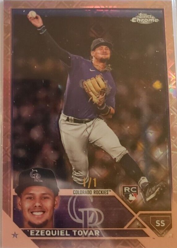 The Ezequiel Tovar 2023 Topps Chrome Logofractor Edition #106 Rose Gold /1 Rookie card in Raw condition has not changed in price in the last 30 days and was last sold for $499.99 .