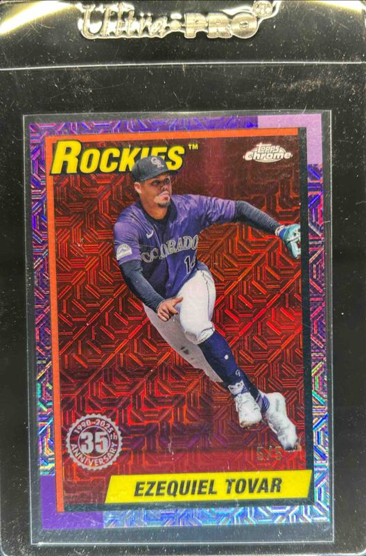 The Ezequiel Tovar 2025 Topps #T90C-115 1990 Baseball Chrome Silver Pack - Red Refractor /5 card is 1 of 93 Ezequiel Tovar's card variations in the 2025 Topps set being tracked by Sports Card Investor, including Base, Aqua Holo Foil, Diamante Foil, Holo Foil, and Pink Diamante Foil.