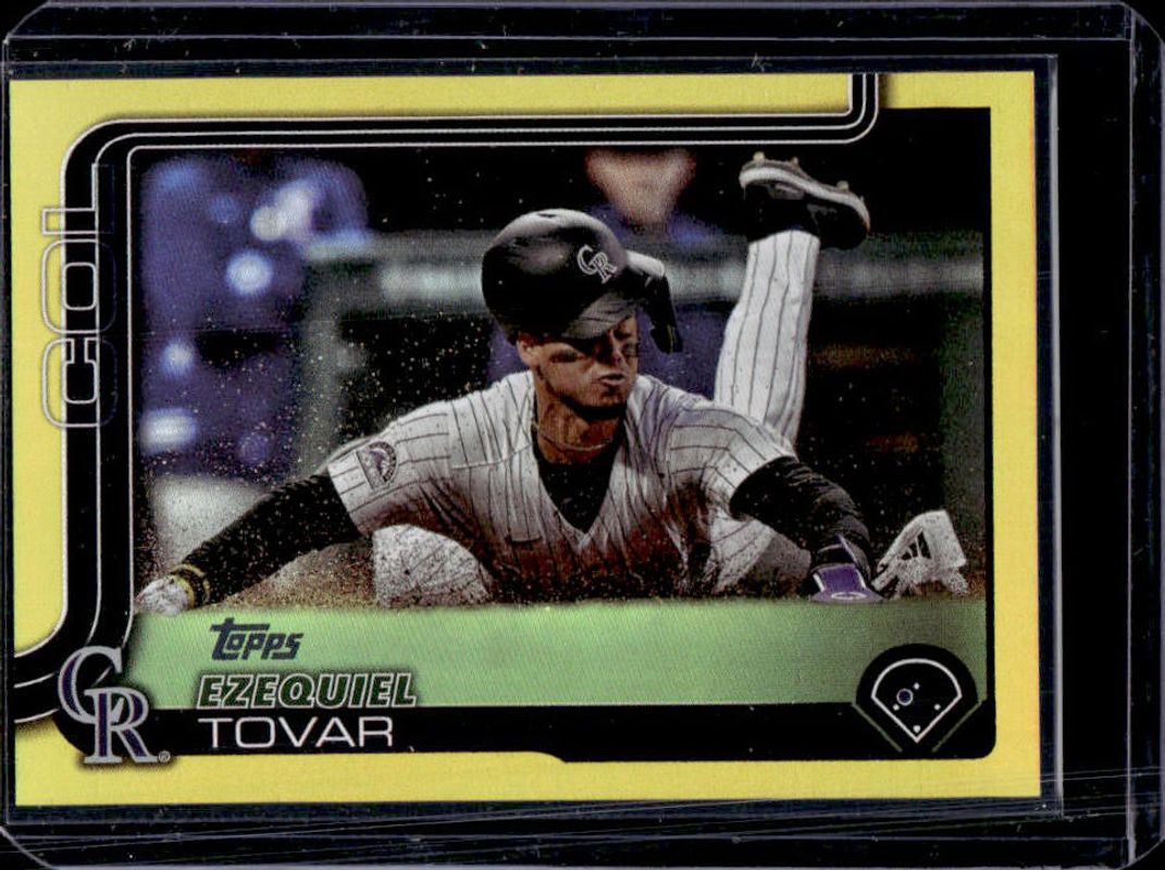 The Ezequiel Tovar 2025 Topps #343 Gold Rainbow /50 card is 1 of 93 Ezequiel Tovar's card variations in the 2025 Topps set being tracked by Sports Card Investor, including Base, Aqua Holo Foil, Diamante Foil, Holo Foil, and Pink Diamante Foil.