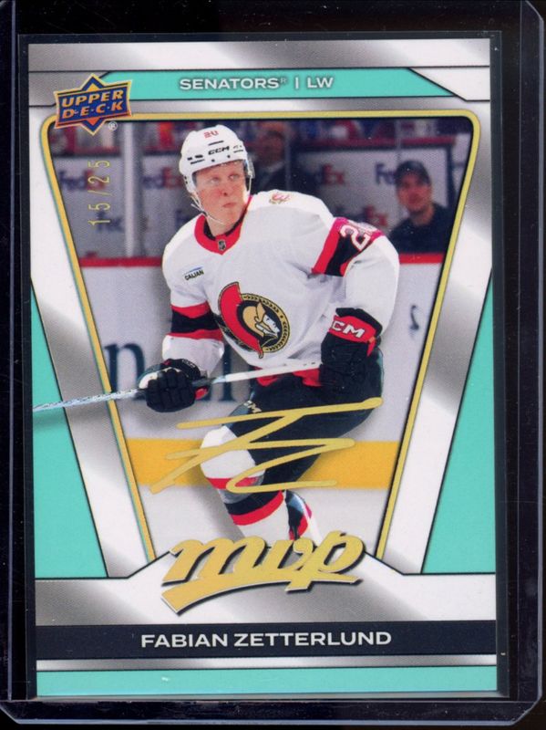 The Fabian Zetterlund 2025 Upper Deck MVP #108 Super Script /25 card is 1 of 8 Fabian Zetterlund's card variations in the 2025 Upper Deck MVP set being tracked by Sports Card Investor, including Base, Gold Script, Silver Script, Black Super Script /1, and Cyan Printing Plate /1.