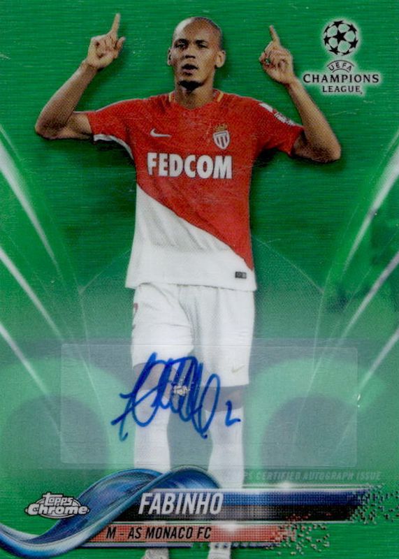 The Fabinho 2017 Topps Chrome UEFA Champions League #84 Autographs - Green Refractor /99 card in Raw condition has not changed in price in the last 30 days and was last sold for $20.49 .