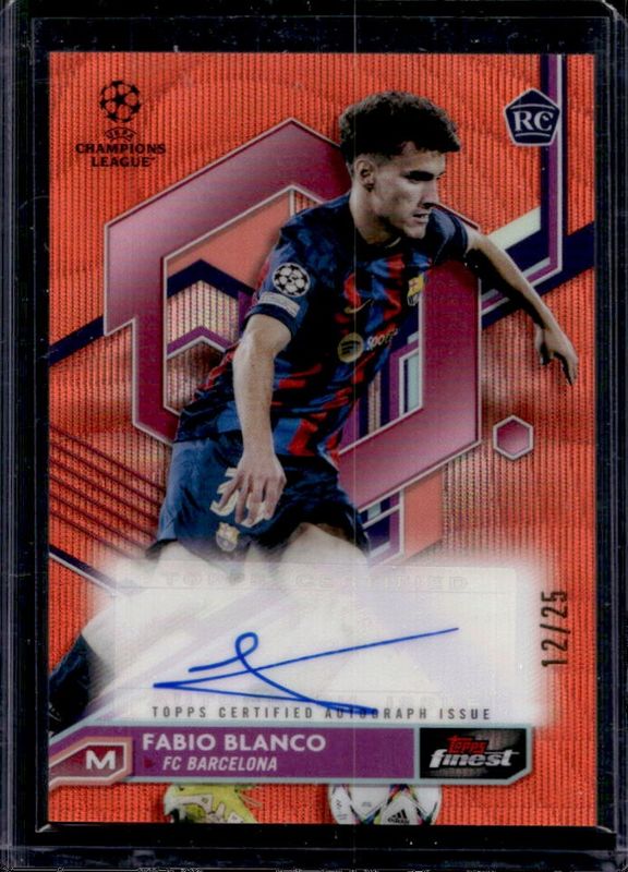 The Fabio Blanco 2022 Topps Finest UEFA Club Competitions #A-FB Autographs - Orange Wave Refractor /25 Rookie card is 1 of 10 Fabio Blanco's card variations in the 2022 Topps Finest UEFA Club Competitions set being tracked by Sports Card Investor, including Autographs, Autographs - Blue Refractor /150, Autographs - Neon Green Refractor /99, Autographs - Neon Green Wave Refractor /99, and Autographs - Gold Refractor /50.