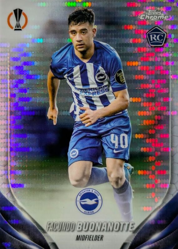 The Facundo Buonanotte 2023 Topps Chrome UEFA Club Competitions #136 Pulsar Refractor Rookie card in Raw condition has not changed in price in the last 30 days and was last sold for $0.99 .