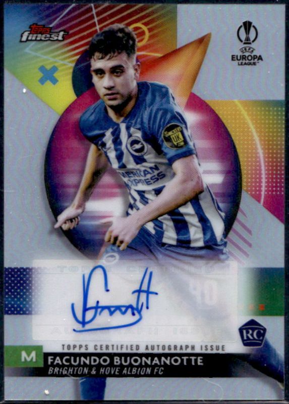 The Facundo Buonanotte 2023 Topps Finest UEFA Club Competitions #A-FB Autographs Rookie card is 1 of 30 Facundo Buonanotte's card variations in the 2023 Topps Finest UEFA Club Competitions set being tracked by Sports Card Investor, including Base, Refractor, Purple /299, Sky Blue /275, and Blue Aqua Vapor Wave /250.